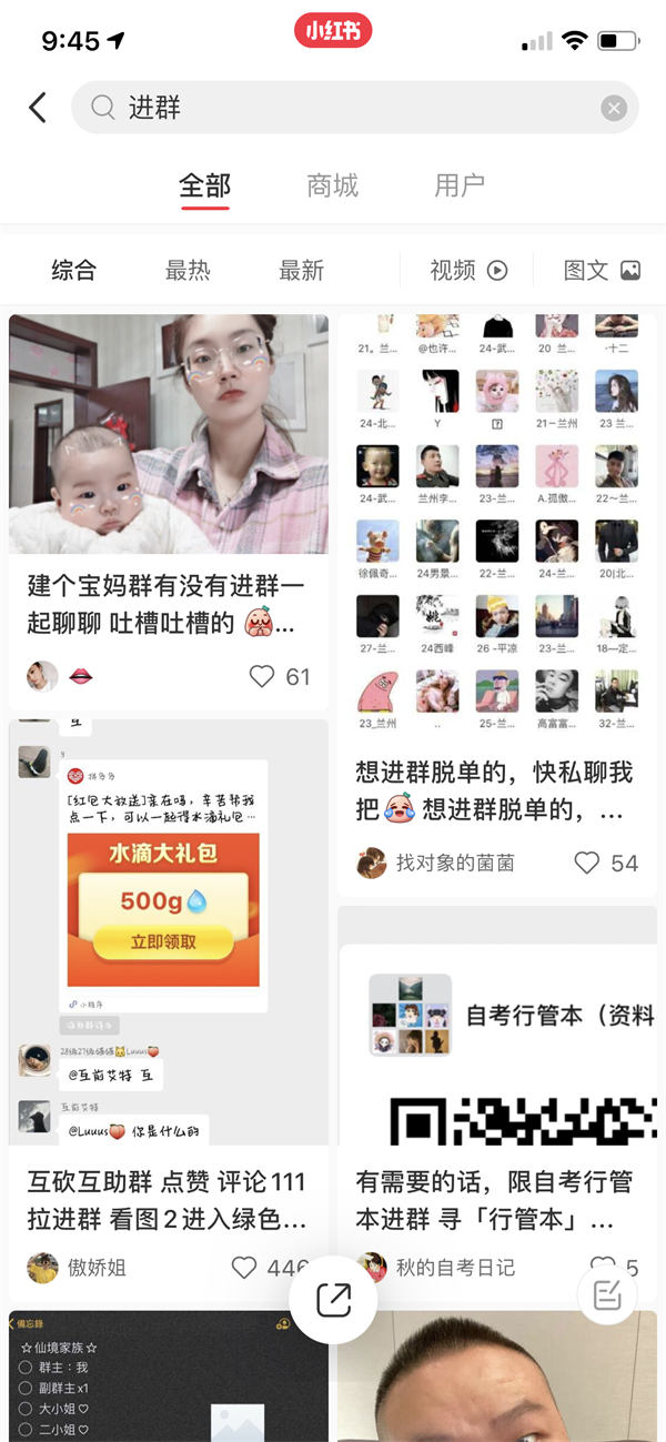 下载小红书 APP,进去之后直接点击右上角搜索按钮,搜索“进群”等关键词,你会发现,有十几万的笔记都是这种建群广告的……