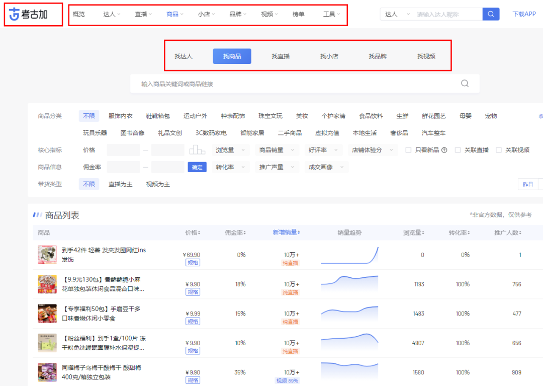 第一种、选品是整个项目中最重要的环节,选品选的对,爆单快,需要借助选品工具,名字叫考古加,选品方法就是在工具里搜关键词,
