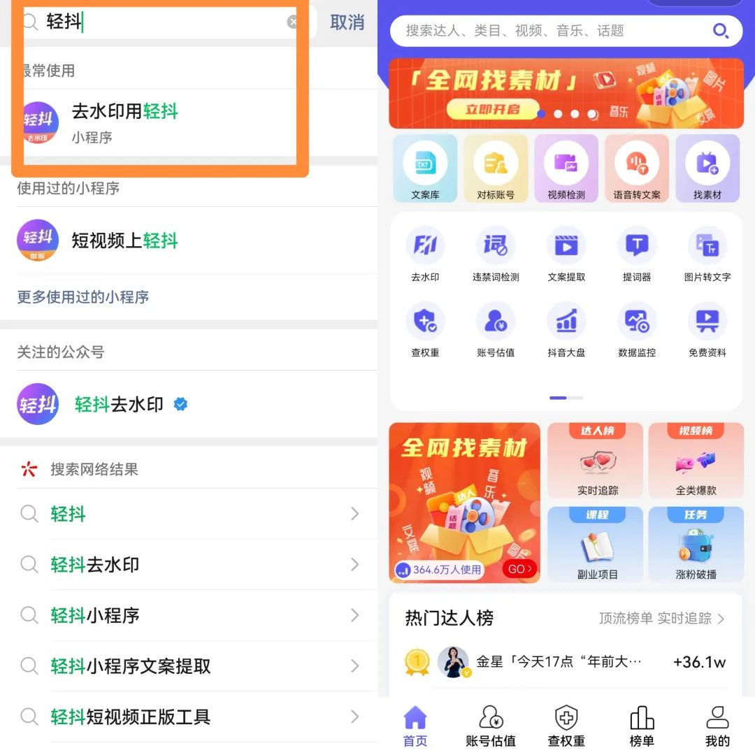 采集素材需要用到去水印工具,一般直接电脑端登录微信,找到小程序轻抖,添加到桌面,后面就方便使用了,如果这个平台使用次数用完了,那就直接小程序搜索去水印,会有几十个去水印平台,几乎每个都可以用,灵活就行。