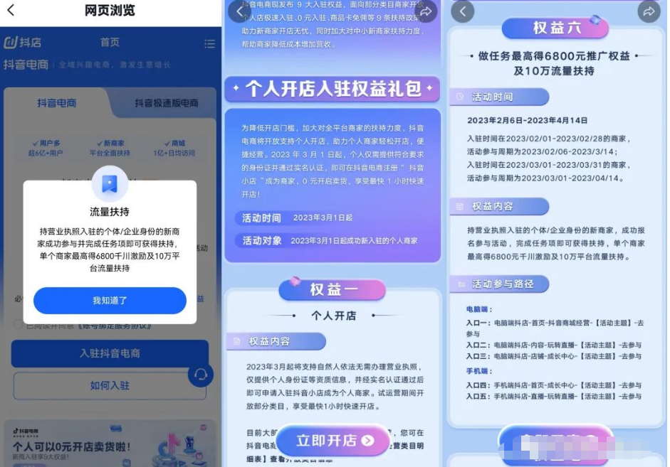 目前还处于推广的阶段,官方有大力扶持给个人小超市,九个权益,最有诱惑的就是抖家扶持,来给大家看一下截图公告,是不是非常给力,在某音里边最挣米的一定是自己当小老板,现在就给了我们个人这样的机会。
