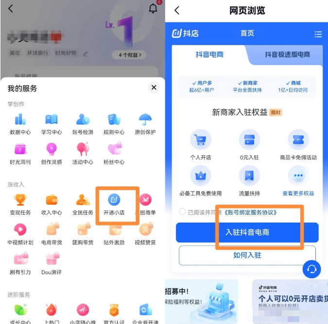 第一步、打开某音,在我的页面右上角点击三条杠,然后找到创作者服务中心,点开通抖店,会跳出一个服务的协议,阅读一下,点最下边的同意,接下来点击入驻抖音电商授权。