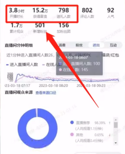在这张截图中不难看出,有的主播直播3.8个小时,送礼观众就有798个,而收入高达15.2万,相当于1.5万的收入,可以说是小成本大收益的项目。