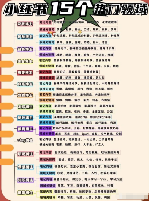 赛道选择,小红薯有美妆护肤、时尚穿搭、珠宝配饰、美食饮品、家居家装、母婴早教、健身减脂、萌宠动物、旅行住宿、教育、职场让心理情感、商业财经等15大类,每一个品类下面还有二次细分类目,二级细分类目接近200多个,每一个品类赛道规模也不一样,可以看一下这张图。