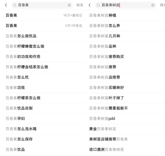 3、SEO布局,抢占百香果树苗种植领域的搜索关键词,俗称SEO,在小红薯平台搜关键词,百香果树苗种植会出现很多的下拉关键词,把这些下拉词全部采集出来,发布视频的时候,标题的开头带上这些关键词,如此一来,视频越发越多,关键词覆盖也会越来越广。