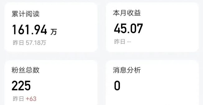 社群有个朋友参与了这个项目。 看到了收益。如果你也想每月赚取500-1000元,相当于播放量需要达到上亿,一万播放大约等于3-5毛钱。 我之前也分享过百家号项目,当时测试收益并没有那么低,一万播放最低能够达到2-3元。但现在的收益似乎下降了,可能是因为参与的人太多了。另一个号更离谱,10万播放只有2块多钱。