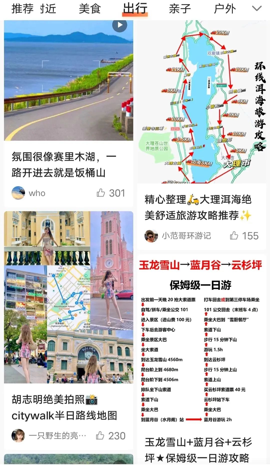 不论是旅游还是美食,小红书上的笔记是最全的。打开小红书,搜索旅游攻略,只要笔记下面带有文案的都可以搬运。