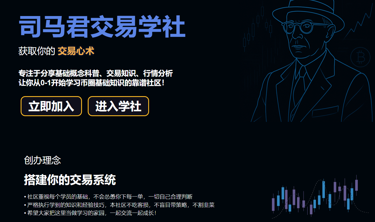 司马君交易学社是一个专注于币圈交易教育的学习型社区,致力于通过系统化的知识体系和专业化的教学方法,帮助交易者建立正确的交易认知和风险管理能力。