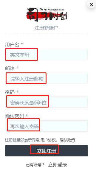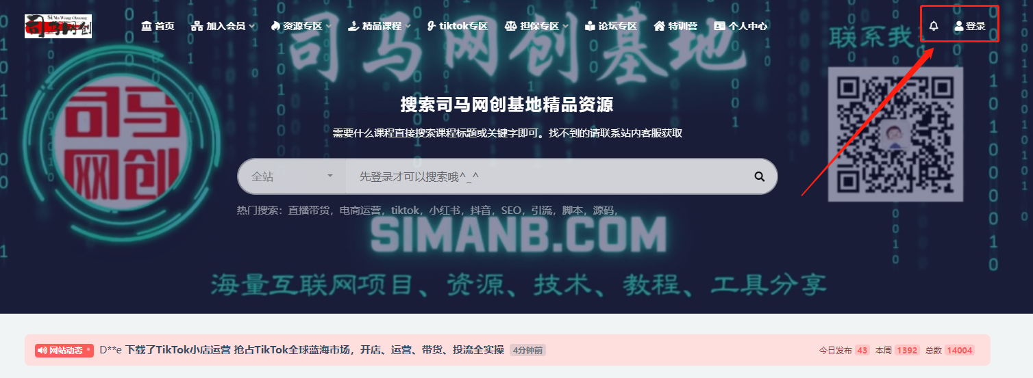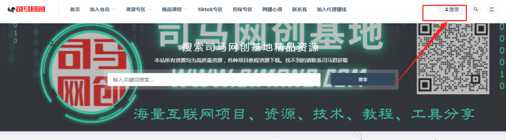 - 首先电脑登录司马网创基地首页:www.simanb.com,点击右上角的登录按钮进行注册: