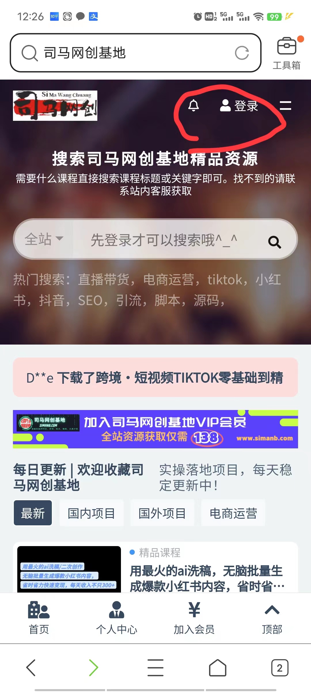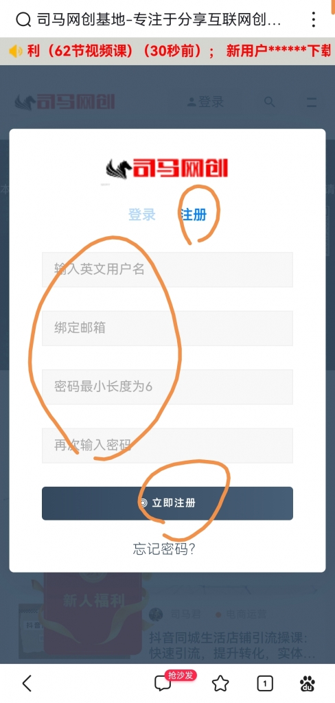 - 同样手机打开浏览器,输入司马网创基地网址:www.simanb.com,点击右上角登录进行注册: